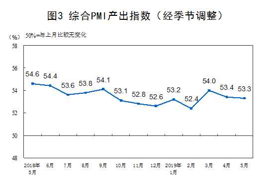2019年5月份,综合PMI产出指数为53.3%,比上月微落0.1个百分点,表明我国企业生产经营活动总体保持平稳发展态势。