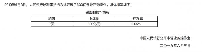 暂停仅一天后,6月3日中国人民银行再度重启公开市场操作。央行公告显示,2019年6月3日,人民银行以利率招标方式开展了期限为7天,数量为800亿元的逆回购操作,中标利率与此前持平。