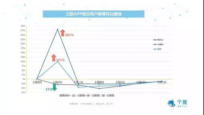 统计结果显示,自1月15日聊天宝、马桶MT、多闪三款社交产品同一天发布后,在15日以及16日形成爆发式增长,其中聊天宝16日相比15日新用户增长达到281%,多闪增长达到101%,之后都出现不同程度的新增用户增速下降,而马桶MT更是在发布次日就已出现了下降。