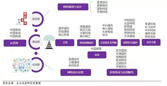 在国泰君安的研报中,将5G的发展分为三个阶段,分别是规划期、建设期、应用期,所涉及的业务种类和产业玩家涵盖元器件和设备提供者、运营商,以及网络集成商等方方面面,产业链上的公司至少上百家。
