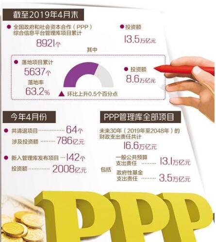 财政部PPP中心最新统计数据显示,截至2019年4月末,全国政府和社会资本合作(PPP)综合信息平台管理库项目累计8921个、投资额13.5万亿元。其中,落地项目累计5637个、投资额8.6万亿元,落地率63.2%,环比上升0.5个百分点。