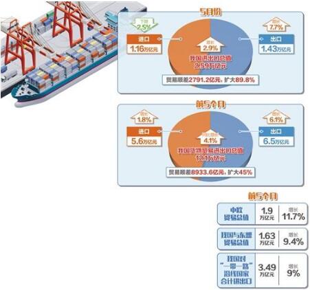 据介绍,5月份我国进出口总值2.59万亿元,增长2.9%。其中,出口1.43万亿元,增长7.7%;进口1.16万亿元,下降2.5%;贸易顺差为2791.2亿元,扩大89.8%。