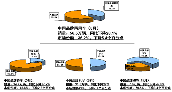 5月,乘用车共销售156.1万辆,环比下降0.9%,同比下降17.4%,降幅仍大于整体汽车市场。在乘用车主要品种中,四大类乘用车品种相比去年产销均呈明显下滑;与上月相比,MPV销量逆势上扬,其他车型降幅也有所收窄。