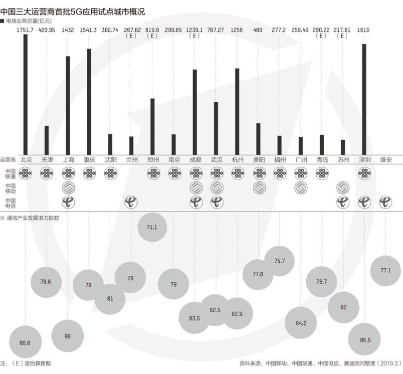 近日,工信部赛迪顾问发布《2019中国首批5G试点城市通信产业发展潜力研究白皮书》(下称“报告”),对三大运营商最初(2018年)确立的18个试点城市(包含雄安新区)的电信业务总量、通信产业发展潜力进行深度梳理与分析,并对5G产业投资规模进行了预测。