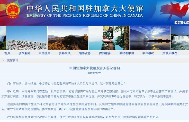 6月26日电 据中国驻加拿大使馆网站26日消息,有加拿大媒体报道,中方将自今日起暂停所有加拿大肉类对华出口,这一消息是否属实?中国驻加拿大使馆发言人对此进行了回应。