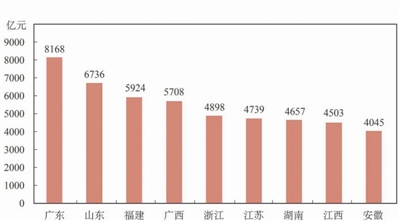 公报显示,林业产业总产值超过4000亿元的省份共有9个,分别是广东、山东、福建、广西、浙江、江苏、湖南、江西和安徽,与2017年相比增加安徽省,其中广东省林业产业总产值独占鳌头,是林业产业总产值唯一超过8000亿元的省份(图三)。