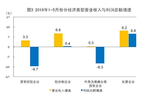 1—5月份,规模以上工业企业中,国有控股企业实现利润总额7342.3亿元,同比下降9.7%;股份制企业实现利润总额16993.1亿元,增长0.4%;外商及港澳台商投资企业实现利润总额5775.8亿元,下降8.3%;私营企业实现利润总额6072.7亿元,增长6.6%。