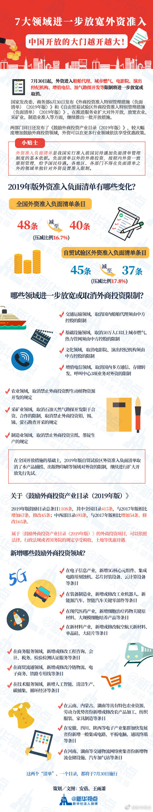 国家发改委有关负责人说,发布实施2019年版外资准入负面清单,是新形势下进一步扩大对外开放的重要举措。本次修订负面清单深入实施新一轮高水平开放,在服务业、制造业、采矿业、农业推出了新的开放措施,在更多领域允许外资控股或独资经营,在自贸试验区继续进行开放试点,将构建更加开放、便利、公平的投资环境,推进更大范围的全球产业链合作。