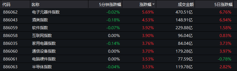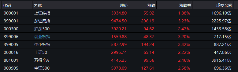 A股跳空高开后继续向上,上证综指午盘涨1.88%,创近两个月新高;深证成指涨3.23%;创业板指涨3.2%;万得全A涨2.46%。两市成交3922亿元,较上日同期放量明显。