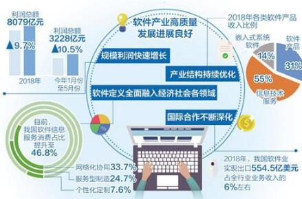 产业结构持续优化。2018年,软件产品、信息技术服务和嵌入式系统软件收入比例为31∶55∶14,其中信息技术服务收入同比增长17.6%。龙头骨干企业利润总额增长19.6%,销售利润率为9.2%,全行业正逐步形成大企业和中小企业融通发展的良好局面。
