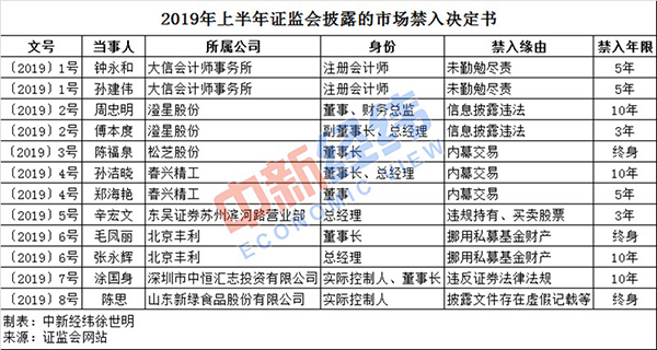 此外,证监会发布的8份市场禁入决定书显示,因为种种缘由,上半年共有12人被证监会采取市场禁入措施。其中,陈福泉、孙洁晓、郑海艳因内幕交易分别被证监会处以终身、10年、5年的市场禁入措施。