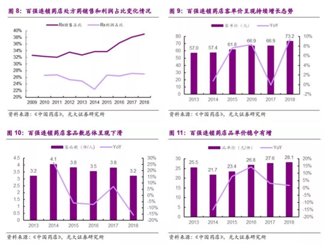 根据光大证券研报,2014~2018年,益丰药房、老百姓、一心堂、大参林四大上市药店的年均营收增速都在19%~31%之间。再从《中国药店》统计的数据来看,近年来药店百强连锁的新开店率(新开店总数/门店总数)在15%上下。无论是药店的开店扩张还是并购整合都存在较大空间。