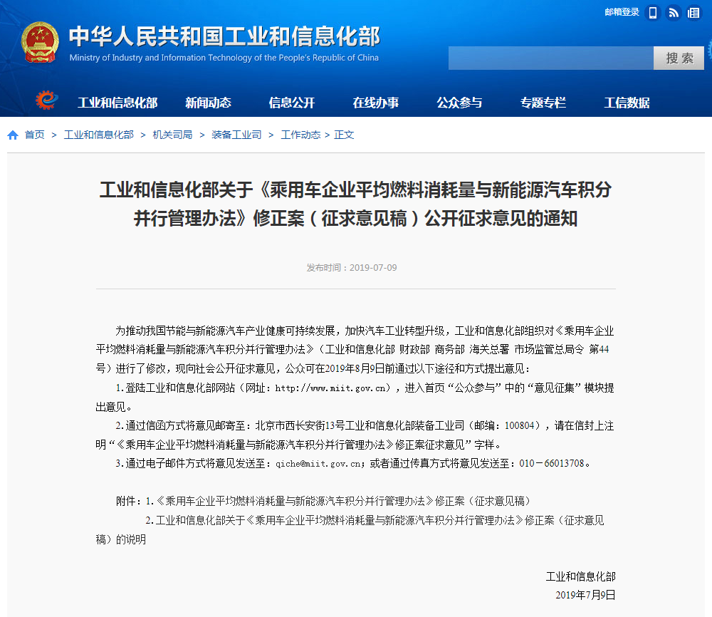7月10日讯 (记者 张懿) 9日,工信部发布《乘用车企业平均燃料消耗量与新能源汽车积分并行管理办法》修正案(征求意见稿)公开征求意见的通知。