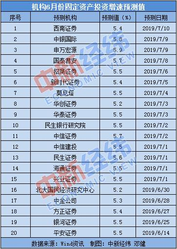 对于6月份的固定资产投资,中新经纬客户端梳理发现,20家机构预测的同比增速平均值为5.5%,最大值5.9%,最小值5.2%。