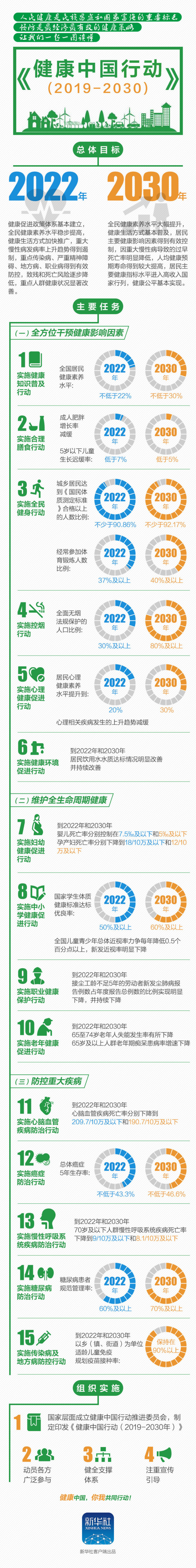 (一)加强组织领导。国家层面成立健康中国行动推进委员会,制定印发《健康中国行动(2019-2030年)》,细化上述15个专项行动的目标、指标、任务和职责分工,统筹指导各地区各相关部门加强协作,研究疾病的综合防治策略,做好监测考核。要根据医学进步和相关技术发展等情况,适时组织修订完善《健康中国行动(2019-2030年)》内容。各地区要结合实际健全领导推进工作机制,研究制定实施方案,逐项抓好任务落实。各相关部门要按照职责分工,将预防为主、防病在先融入各项政策举措中,研究具体政策措施,推动落实重点任务。