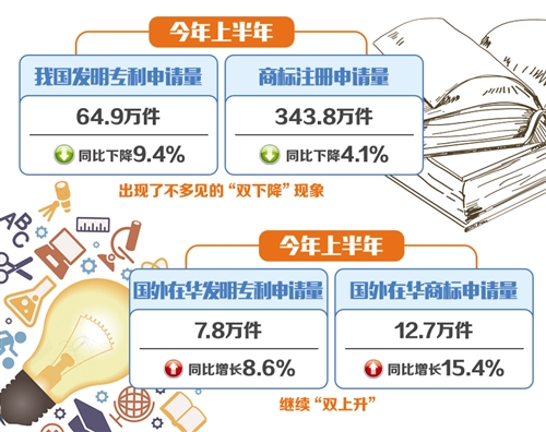数据显示,今年上半年,我国发明专利申请量为64.9万件,同比下降9.4%;商标注册申请量为343.8万件,同比下降4.1%,出现了不多见的“双下降”现象。但国外在华知识产权申请却稳步增长。上半年,国外在华发明专利申请量达到7.8万件,同比增长8.6%;国外在华商标申请量为12.7万件,同比增长15.4%,继续“双上升”。