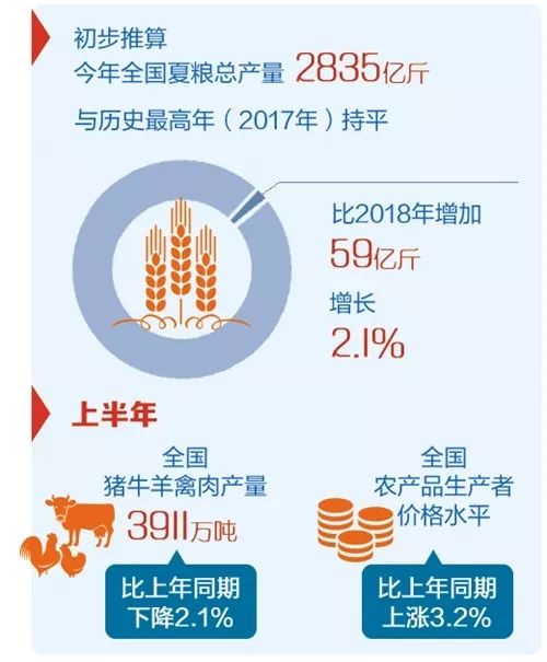 初步推算,今年全国夏粮总产量2835亿斤,比2018年增加59亿斤,增长2.1%,与历史最高年(2017年)持平。其中,小麦产量2621亿斤,增加53亿斤,增长2.1%。