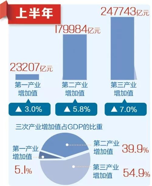 从三次产业看,上半年三次产业增加值占GDP的比重分别为5.1%、39.9%和54.9%。与上年同期相比,第一产业比重下降0.1个百分点,第二产业比重下降0.5个百分点,第三产业比重提高0.5个百分点。三次产业对经济增长贡献率分别为2.6%、37.1%和60.3%。第三产业对经济增长贡献率高于第二产业23.2个百分点。
