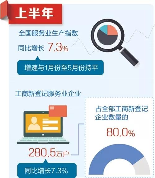 服务业市场主体持续扩大。上半年,工商新登记服务业企业280.5万户,同比增长7.3%,占全部工商新登记企业数量的80.0%。