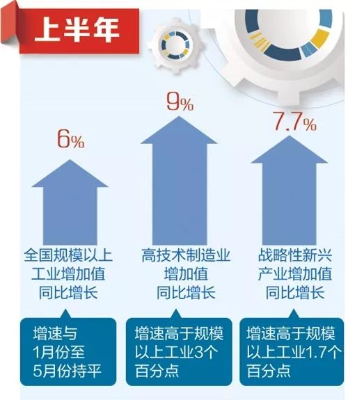 上半年,规模以上工业战略性新兴产业增加值同比增长7.7%,规模以上高技术制造业增加值同比增长9.0%,分别高于全部规模以上工业增加值增速1.7个和3.0个百分点。以新技术为引领的相关服务业继续保持较快增长,1月份至5月份,规模以上战略性新兴服务业、科技服务业和高技术服务业营业收入增速分别为12.5%、12.0%和12.3%。上半年全国网上零售额同比增长17.8%,其中实物商品网上零售额同比增长21.6%,占社会消费品零售总额比重为19.6%。