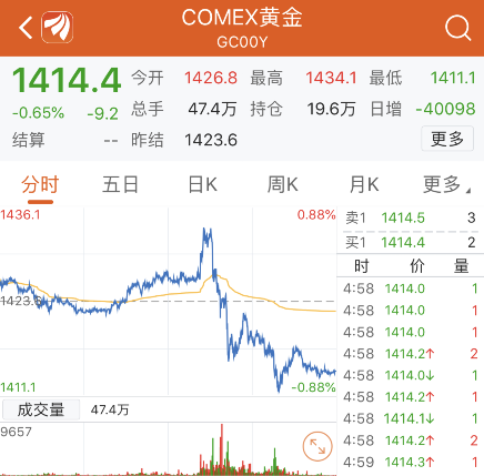 同样受此消息影响,黄金市场方面,COMEX黄金大跌0.65%,报收1414.4美元/盎司。
