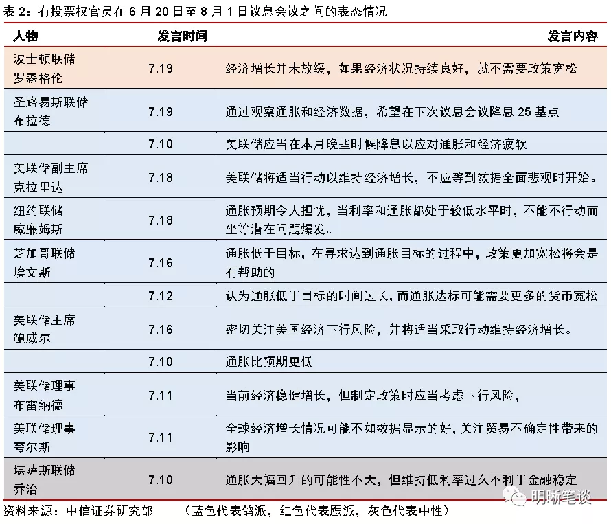 对比6月会议声明内容,美联储在7月份的会议声明中延续了此前偏鸽派的立场,认为经济发展“仍然存在不确定性”。具体表述上,就业“劳动力市场维持强劲”,经济活动方面维持此前“经济增速温和”的表述。延续了6月声明中“密切监测未来经济信息隐藏的暗示,并将采取适当行动以维持经济增长、劳动力市场强劲、通胀接近2%目标”。