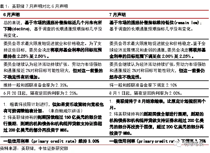 会议内容及解读:对比6月会议声明内容,美联储在7月份的会议声明中延续了此前偏鸽派的立场,认为经济发展“仍然存在不确定性”。具体表述上,就业“劳动力市场维持强劲”,经济活动方面维持此前“经济增速温和”的表述。延续了6月声明中的表述“密切监测未来经济信息隐藏的暗示,并将采取适当行动以维持经济增长、劳动力市场强劲、通胀接近2%目标”。除了市场预期的降息,美联储本次议息会议还决议下调一般和超额准备金率,并宣布于8月结束缩表;结束缩表的安排为将美联储持有的到期国债全部进行展期,到期的机构债务和机构抵押贷款支持证券未超过200亿美元的部分再投资于国债,超过200亿美元的部分再投资于MBS;配套措施还包括隔夜逆回购利率下调25bp至2.00%、贴现率下调25bp至2.75%。