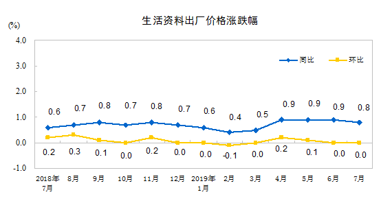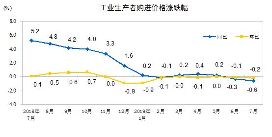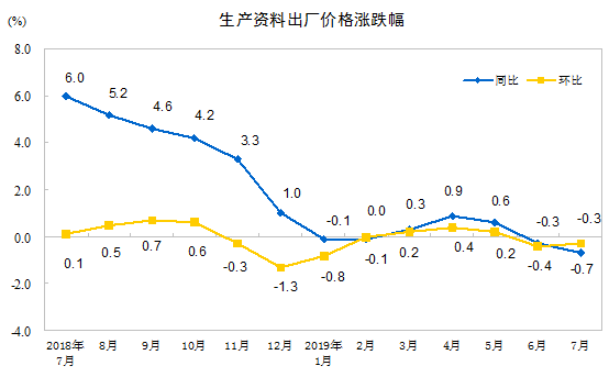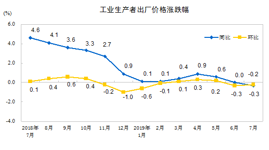 2019年7月份,全国工业生产者出厂价格同比下降0.3%,环比下降0.2%;工业生产者购进价格同比下降0.6%,环比下降0.2%。1—7月平均,工业生产者出厂价格比去年同期上涨0.2%,工业生产者购进价格持平。
