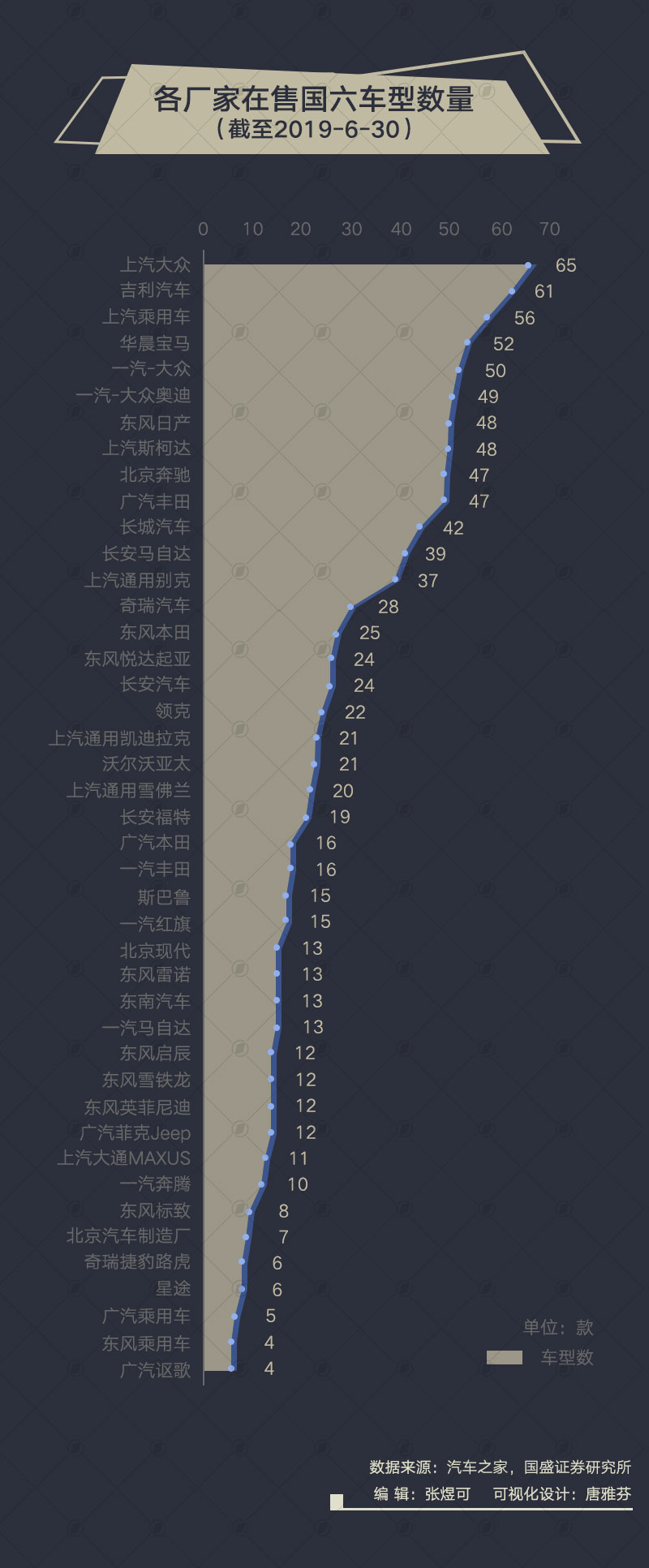 前五龙头厂商推出的国六车型数量约占全行业的67%(吉利、上汽、长城、奇瑞、长安)。