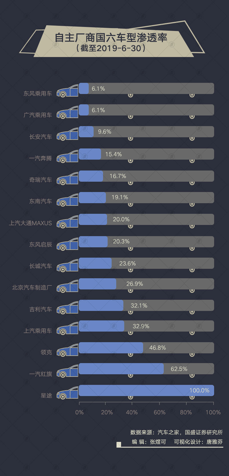 观察各自主厂商国六车型渗透率发现,仅有一汽红旗与星途超过50%。