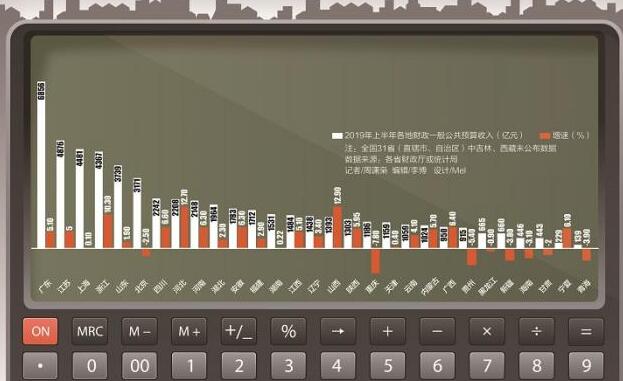 上半年,广东、江苏、上海继续稳居财政收入总量前三,随后是浙江、山东、北京。东部六省财政收入规模均超过3000亿元,但大省内部形势分化明显。