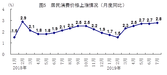 7月份,全国居民消费价格同比上涨2.8%,涨幅比上月扩大0.1个百分点,环比上涨0.4%。分类别看,7月份,食品烟酒价格同比上涨6.7%,衣着上涨1.8%,居住上涨1.5%,生活用品及服务上涨0.8%,交通和通信下降2.1%,教育文化和娱乐上涨2.3%,医疗保健上涨2.6%,其他用品和服务上涨3.4%。扣除食品和能源价格后的核心CPI上涨1.6%,涨幅与上月持平。1-7月份,全国居民消费价格同比上涨2.3%。