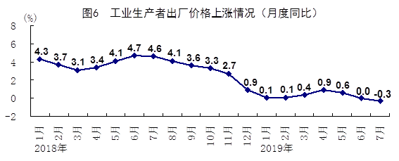 7月份,全国工业生产者出厂价格同比下降0.3 %,环比下降0.2%。全国工业生产者购进价格同比下降0.6%,环比下降0.2%。1-7月份,全国工业生产者出厂价格同比上涨0.2%,全国工业生产者购进价格同比持平。