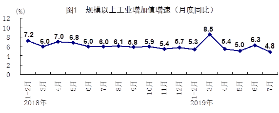7月份,全国规模以上工业增加值同比增长4.8%,增速比上月回落1.5个百分点。1-7月份,全国规模以上工业增加值增长5.8%,增速比1-6月份回落0.2个百分点。分经济类型看,7月份,国有控股企业增加值增长3.7%,股份制企业增长6.1%,外商及港澳台商投资企业下降0.2%。分三大门类看,采矿业增加值增长6.6%,制造业增长4.5%,电力、热力、燃气及水生产和供应业增长6.9%。高技术制造业增加值增长6.6%,比规模以上工业快1.8个百分点;微型计算机设备、太阳能电池产量分别增长14.5%和34.3%。7月份,制造业采购经理指数(PMI)分项指数中,生产指数和供应商配送时间指数分别为52.1%和50.1%,均高于临界点。