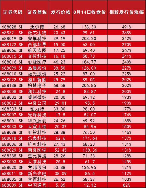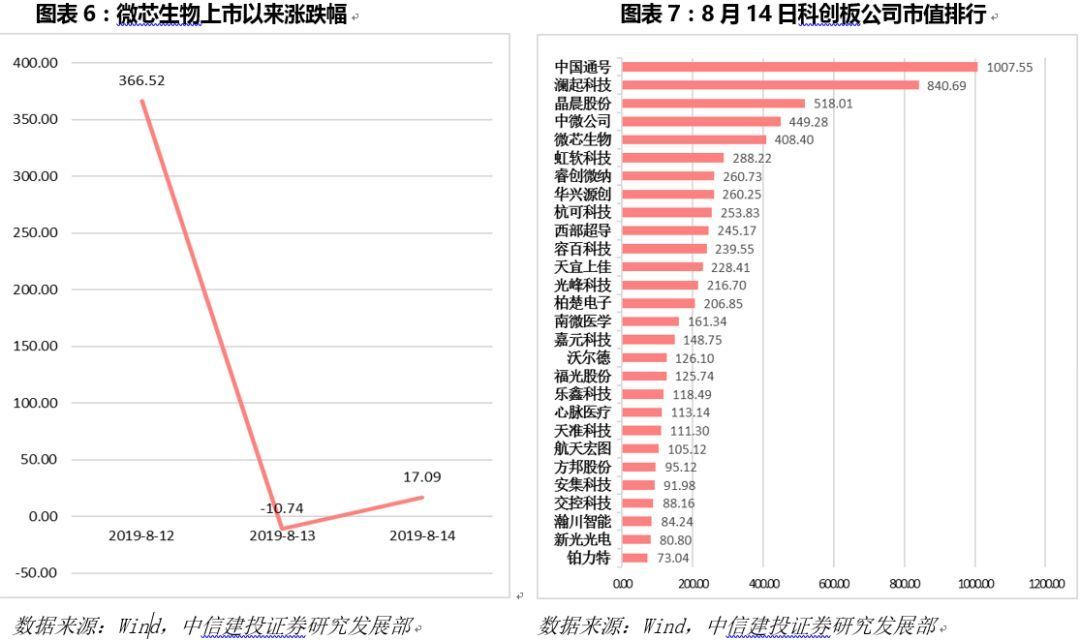本周一(8月12日),微芯生物正式登陆科创板,其市场表现引起不小轰动。微芯生物发行价为20.43元/股,首日高开511.85%,期间股价一度达到125元,市盈率更是飙至近2000倍,刷新科创板估值。其作为28家科创板上市企业中第一家原研药企,为市场所看好,最终当日收盘价为95.31元,相较发行价涨幅达到366.52%,换手率为80.76%。微芯生物后续两天表现有所震荡,周二下跌10.74%,周三上涨17.09%。