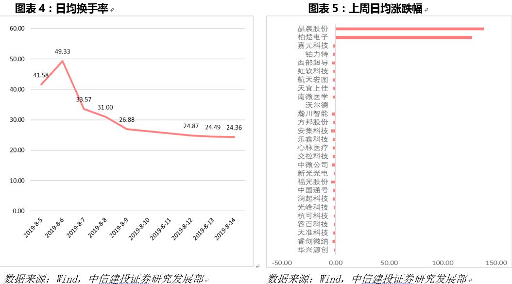 上周,科创板整体运行稳中有降,平均周跌幅11.55%;整体换手率逐日下降,从5日的日均换手率41.58%阶梯式下降至9日的26.88%,截至14日收盘,日均换手率基本保持在24%左右。