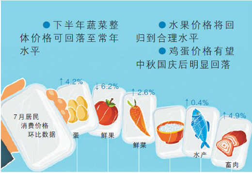 与上月相比,7月CPI由下降0.1%转为上涨0.4%。其中,食品价格环比由上月下降0.3%转为上涨0.9%,影响CPI环比涨幅扩大约0.19个百分点。促使食品价格由降转升的具体因素有哪些?