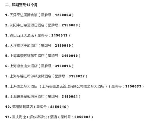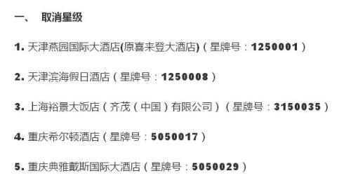 8月19日,全国旅游星级饭店评定委员会发布公告指出,在近期文化和旅游部组织开展的暗访检查中发现,部分五星级饭店的卫生和消防安全问题严重,服务不规范问题突出,决定对5家饭店予以取消五星级旅游饭店资格的处理,分别是天津燕园国际大酒店、天津滨海假日酒店、上海裕景大饭店、重庆希尔顿酒店、重庆典雅戴斯国际大酒店,对11家饭店予以限期整改12个月的处理。(记者 李金磊)