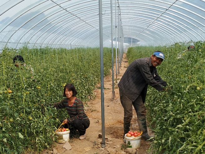 炎炎热夏,正是瓜果蔬菜上市的好时节。在距离北京约180公里的的河北省张家口市赤城县茨营子乡韩家栅子村里,姜泽、陈瑞芳两口子正组织五六位村民忙着采摘。“来,吃一个试试看。”姜泽热情地摘了一颗鲜红饱满的番茄递过来:“我们的产品都是当水果生吃的新品种,甜度在8.0以上,又甜汁水又多,比市面上其他品种的口感好多了。”