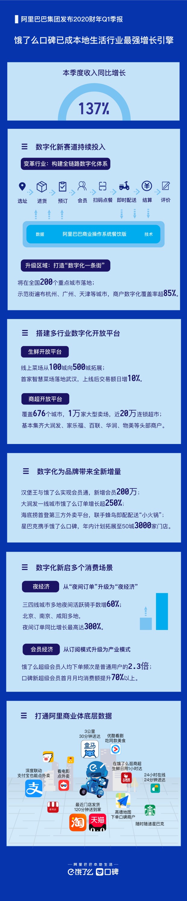 在营收强劲增长背后,是口碑饿了么在数字化消费新场景中动作频频。本季度,口碑饿了么坚定推动餐饮行业全链路数字化升级,并向生鲜、商超等领域推广,建立全新的数字化开放平台。同时全面下沉更多三四线城市,宣布蜂鸟即配品牌独立,与阿里体系内的天猫、淘宝、支付宝、高德等多个生态,实现底层打通和数据流转。