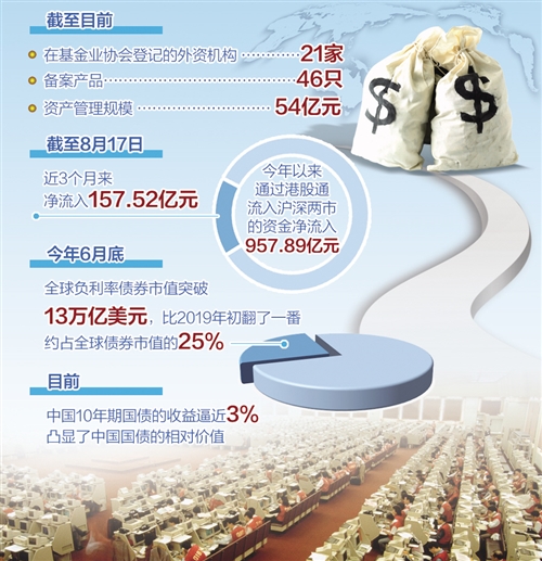 在债券市场上,外资加仓更为明显。8月11日,中央结算公司和上海清算所最新数据显示,截至7月底,境外机构累计持有中国人民币债券的规模首次突破2万亿元。7月份,海外资本净买入债券量与交易量均呈现上升态势。