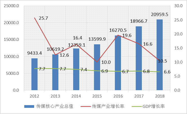 2012~2018年中国传媒产业总值与年增长率