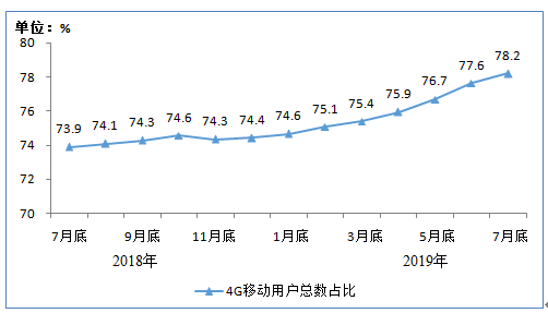 2018年7月底-2019年7月底4G用户总数占比情况