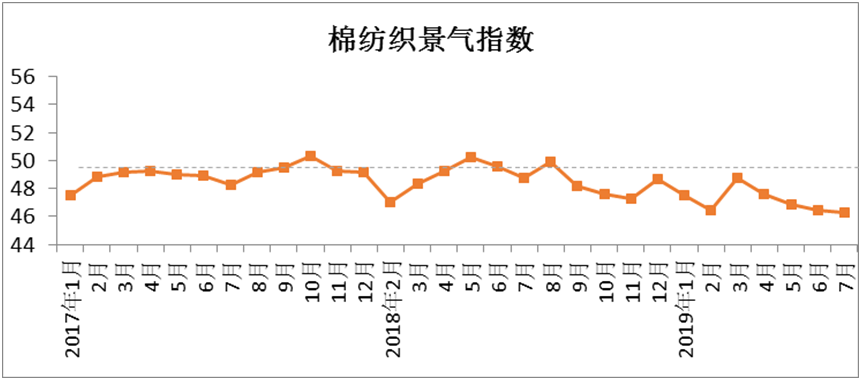 2019年7月中国棉纺织景气指数46.25,与6月相比下降0.18。7月,棉纺织景气度依然不高。月初,贸易摩擦局势在中美双方领导人的会晤后得到短暂缓和,市场出现回暖,原料价格停止下跌,秋冬季订单陆续启动,下游询价有所增加。但由于新增订单的量小且数量少,因此纱布价格依然缺乏上涨支撑,纺企走货基本以消化库存为主。中美贸易磋商的不确定性使得市场回暖仅维持一周后又迅速转向观望状态,8月初,美国总统特朗普声称将对中国3000亿美元输美商品加征10%关税,并于2019年9月1日起执行,消息一出,全球哗然。虽然近期特朗普表示原定于9月1日增加关税的部分产品推迟到12月15日,但其反反复复的态度已不能让企业完全信任。8月是纺织行业由淡季步入旺季的过渡期,但目前市场依然如平静的湖面没有一丝波澜。因此,预计8月中国棉纺织景气指数上升概率较小。