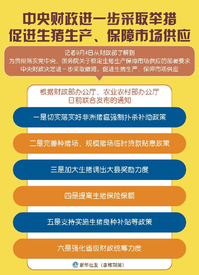 北京9月4日电(记者申铖)记者4日从财政部了解到,为贯彻落实党中央、国务院关于稳定生猪生产保障市场供应的部署要求,中央财政决定进一步采取措施,促进生猪生产、保障市场供应。