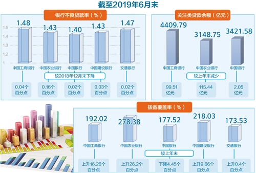 具体来看,截至今年6月末,中国工商银行、中国农业银行、中国银行、中国建设银行、交通银行的不良贷款率分别为1.48%、1.43%、1.40%、1.43%、1.47%,分别较2018年12月末下降0.04个百分点、0.16个百分点、0.02个百分点、0.03个百分点、0.02个百分点。