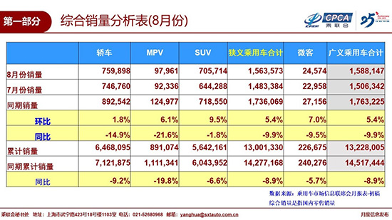 8月,我国狭义乘用车销量1563573辆,环比增长5.4%,同比下滑9.9%;1-8月,狭义乘用车累计销量同比下降8.9%,下滑幅度略微增大。