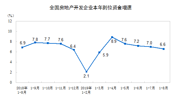 1—8月份,房地产开发企业到位资金113724亿元,同比增长6.6%,增速比1—7月份回落0.4个百分点。其中,国内贷款17322亿元,增长9.8%;利用外资81亿元,增长1.3倍;自筹资金36036亿元,增长3.1%;定金及预收款38377亿元,增长8.3%;个人按揭贷款17449亿元,增长11.8%。