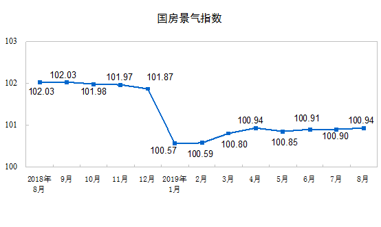 8月份,房地产开发景气指数(简称“国房景气指数”)为100.94,比7月份提高0.04点。