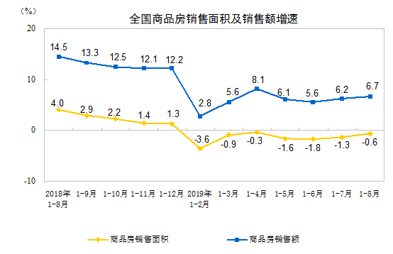 1—8月份,商品房销售面积101849万平方米,同比下降0.6%,降幅比1—7月份收窄0.7个百分点。其中,住宅销售面积增长0.6%,办公楼销售面积下降10.8%,商业营业用房销售面积下降13.9%。商品房销售额95373亿元,增长6.7%,增速加快0.5个百分点。其中,住宅销售额增长9.9%,办公楼销售额下降11.7%,商业营业用房销售额下降12.8%。